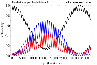 Predicted oscillation probability of electron neutrinos (black) oscillating to muon (blue) or tau (red) neutrinos, as a function of distance from source. Existing short-baseline experiments measure the first small dip in the black curve at 500 km/GeV; JUNO will observe the large dip at 16000 km/GeV. For reactor neutrinos with an energy of ≈3 MeV, the distances are ≈1.5 km and ≈50 km, respectively. This plot is based on assumed mixing parameters; the measured shape will differ and allow the actual parameters to be computed.