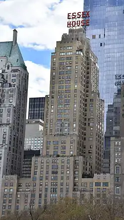 The JW Marriott Essex House (commonly known as the Essex House) is a luxury hotel at 160 Central Park South in Midtown Manhattan, New York City, at the southern border of Central Park. Opened in 1931, the hotel is 44 stories tall and contains 426 Art Deco–style rooms and 101 suites, as well as 147 condominium residences.[2] It features a distinctive red neon rooftop sign.