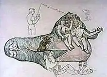 Jabba the Hutt's physical appearance reinforces his personality as a criminal deviant. In Return of the Jedi, Han Solo calls Jabba a "slimy piece of worm-ridden filth". Film critic Roger Ebert described him as "a cross between a toad and the Cheshire Cat."[25] Incidentally, the word for "toad" or "frog" in Slavic languages (zhaba, жаба) sounds very close to "Jabba," while in Arabic حُوت (ḥūt) means "fish / whale". Science fiction writer Jeanne Cavelos wrote that Jabba deserved the "award for most disgusting alien".[26] Science fiction authors Tom and Martha Veitch wrote that Jabba's body is a "miasmic mass", and that "[t]he Hutt's lardaceous body seemed to periodically release a greasy discharge, sending fresh waves of rotten stench" into the air.[27] Jabba's appetite is insatiable, and some authors portray him threatening to eat his subordinates.[28][29] The Hollywood Reporter's Arthur Knight called Jabba a "truly frightening... gross walrus-shaped grotesque."[30]