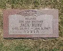 Ruby died of a pulmonary embolism on January 3, 1967, at Parkland Hospital.[53][54] He was buried beside his parents in the Westlawn Cemetery in Norridge, Illinois.[55][56][57]