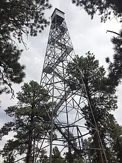 Built in 1934 by the Civilian Conservation Corps (CCC), it is an 80 feet (24 m) Aermotor steel tower with a 7 by 7 feet (2.1 m × 2.1 m) metal cab and is listed on the National Register of Historic Places.[3][4] Visitors can read about the lookout process and can still climb the tower to view the area and see the Osborne Fire Finder.
