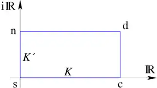 In the complex plane of the argument , the twelve functions form a repeating lattice of simple poles and zeroes.[3] Depending on the function, one repeating parallelogram, or unit cell, will have sides of length or on the real axis, and or on the imaginary axis, where and are known as the quarter periods with being the elliptic integral of the first kind. The nature of the unit cell can be determined by inspecting the "auxiliary rectangle" (generally a parallelogram), which is a rectangle formed by the origin at one corner, and as the diagonally opposite corner. As in the diagram, the four corners of the auxiliary rectangle are named , , , and , going counter-clockwise from the origin. The function will have a zero at the corner and a pole at the corner. The twelve functions correspond to the twelve ways of arranging these poles and zeroes in the corners of the rectangle.