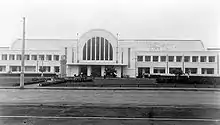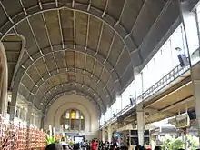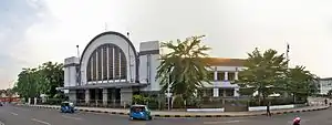 The southern BOS station was closed in 1923,[5] and was rebuilt between 1926 and 1929, during which all rail services were temporarily taken over by the Batavia North station. The station building was designed in 1927–1928 by the architects Asselbergs, Frans Johan Louwrens Ghijsels, and Hes from the architectural company Algemeen Ingenieurs-en Architectenbureau (AIA) in Batavia. During construction in 1928–1929 concrete from the Hollandsche Beton Maatschappij ("Dutch Concrete Company") was used.[5] The main building was designed with 12 railway tracks, designated to connect Batavia with Buitenzorg, the port of Tandjoeng Priok, and the port of Merak near the Sunda Strait with a ferry connecting Western Java with Southern Sumatra.[5] The new and current building was officially opened on 8 October 1929 with a private ceremony by the company staff.[6] All rail services to the old city were then reassigned to the new southern station, while the remaining northern station was demolished.