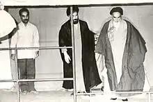Ruhollah Khomeini along with Ahmad Khomeini and Mohammad-Ali Rajai in Jamaran Hussainiya, August 1981