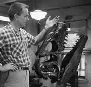 Because of Jensen's experience in manufacturing, he was aware of techniques, equipment and materials not generally used in museum displays. For example, in 1958, he pioneered the use of a novel industrial product, "rigid foam", for casting dinosaur bones as illustrated by the adjacent photo of an allosaurus skull cast in foam.[16] He worked at the time in the Department of Vertebrate Paleontology, Museum of Comparative Zoology, in the Peabody Museum at Harvard University. By experimenting with an Allosaurus skull he refined the technique and then published his findings in 1961.[17]