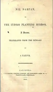 In 1861, at the height of the Indigo revolt by the ryots in Bengal, Long received a copy of the Bengali play Nil Darpan (also transcribed as Neel Darpan or Nil Durpan) from its author Dinabandhu Mitra, who had been one of Long's students at the CMS school on Amherst Street. The play, published anonymously the previous year in Dacca, was sympathetic to the abject condition of the ryots or labourers on indigo plantations and critical of European planters for their treatment of indigo cultivators.[7] Long brought it to the notice of Walter Scott Seton-Karr, Secretary to the Governor of Bengal and ex-President of the Indigo Commission. Seton-Karr, sensing its importance, mentioned Nil Durpan in conversation with the Lieutenant Governor, John Peter Grant. Grant then expressed a wish to see a translation of it and print a few copies to be circulated privately amongst friends. Long had it anonymously translated into English "By A Native" (Long refused to divulge the name of the translator to the trial court; Bankim Chandra Chattopadhyay later attributed the translation to Michael Madhusudan Dutt, although this attribution remains contentious[8]) and printed in either April or May 1861.[9] In his introduction to the play, he wrote that "[i]t is the earnest wish of the writer of these lines that harmony may be speedily established between the Planter and the Ryot..."[10] Long sent the translated manuscript to Clement Henry Manuel, the proprietor of the Calcutta Printing and Publishing Press, to print five hundred copies at the cost of some three hundred rupees. Unknown to the Lieutenant Governor, Long began sending out copies in official Government envelopes to prominent Europeans both in India and abroad that had the heading: "on her Majesty’s Service."[11]