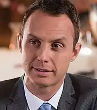 Daniel Kilkelly from Digital Spy branded James a "schemer" and that threatening other characters is his usual trick.[41] He later commented that "schemer James" met his match in Warren Fox (Jamie Lomas).[42] Carl Greenwood from the Daily Mirror branded James a "creepy solicitor" and "evil" character.[43] Rhys Matthews writing for Attitude branded him a "shady village newcomer" and opined that James indecent proposal story was "very dark".[44] A What's on TV reporter echoed other critics in calling the character Marnie's "scheming son".[45] Lindsay writing for Metro labelled him "shady James" who had been "hanging around Starry like a bad smell" and proprietor of "underhand developments".[46][47] Anthony D. Langford writing for TVSource Magazine said that he loved the character and believed he and John Paul have good chemistry. Though he could not believe James is allowed to practise law when he advises clients to commit perjury.[48] In September 2016, Kilkelly branded James one of the show's "best new characters" and called Finnegan a "rising star" in the role.[49][50]