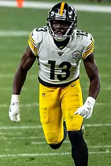 Washington was placed on the reserve/COVID-19 list by the Steelers on August 2, 2020,[28] and was activated five days later.[29] In Week 1 against the New York Giants, Washington caught 2 passes for 34 yards and his first receiving touchdown of the season during the 26–16 win.[30] In Week 6 against the Cleveland Browns, Washington caught 4 passes for 68 yards and a receiving touchdown in a blowout 38-7 win.[31]