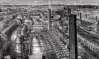 In 1852 Young left Manchester to live in Scotland and that same year took out a US patent[5] for the production of paraffin oil by distillation of coal. Both the US and UK patents were subsequently upheld in both countries in a series of lawsuits and other producers were obliged to pay him royalties.[4] Torbanite was exceptionally rich, yielding 537 litres of petroleum spirit per tonne but it was a finite resource, which was completely exhausted by 1862. Geological surveys at the time showed the potential for similar sedimentary deposits in West Lothian, leading to the discovery of oil shales at Broxburn in 1858.[6] The oil shales were less rich, typically yielding 150-180 litres per tonne, but the discovery meant that Young could extend his operations to West Lothian.