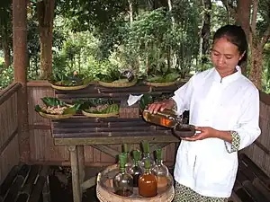 Jamu (Van Ophuijsen Spelling: Djamoe; Javanese: ꦗꦩꦸ) is a traditional medicine from Indonesia. It is predominantly a herbal medicine made from natural materials, such as roots, bark, flowers, seeds, leaves and fruits.[1] Materials acquired from animals, such as honey, royal jelly, milk and native chicken eggs are often used as well.