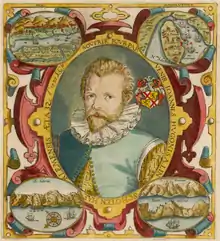 Jan Huygen van Linschoten also wrote two other books, Beschryvinghe van de gantsche custe van Guinea, Manicongo, Angola ende tegen over de Cabo de S. Augustijn in Brasilien, de eyghenschappen des gheheelen Oceanische Zees (Description of the Entire Coast of Guinea, Manicongo, Angola and across to the Cabo de St. Augustus in Brazil, the Characteristics of the Entire Atlantic Ocean), published in 1597; and Itinerario: Voyage ofte schipvaert van Jan Huygen van Linschoten naer Oost ofte Portugaels Indien, 1579-1592 (Travel account of the voyage of the sailor Jan Huygen van Linschoten to the Portuguese East India), published in 1596. "The frontispiece of the first edition [was] pirated [from] the engraving from (of all things) a work celebrating the campaigns of a Spanish general and printed...up as the Dutch hero" by his publisher Joost Gillis Saeghman.[11] The map published in this book, Exacta & accurata delinatio… regionibus China, Cauchinchina, Camboja, sive Champa, Syao, Malacca, Arracan & Pegu, was prepared by Petrus Plancius.[12]