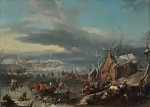 Jan Pieter van Bredael also painted many landscapes with villages and popular revelries, games and celebrations. An example are the pair of compositions of Winter and Summer (Sold by Cambi on 13 March 2013, lot 258) depicting winter and summer activities in respectively a Flemish and an Italianate village.[9]