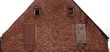 The truly principal feature of this gable, however, are die initials "T" and "I V H" worked in the masonry in black clinker brick headers. These are the monograms of the first occupants of the house, Jan van Hoesen (1687–1745) and his wife Tanneke. The "T" stands for Tanneke, given name of the wife of Jan Van Hoesen, Tanneke Wittbeck. The letters "V" and "H" stand for Jan's family name Van Hoesen. Jan's given name is represented by the letter "I", which is the Dutch representation of the letter "J".[2]