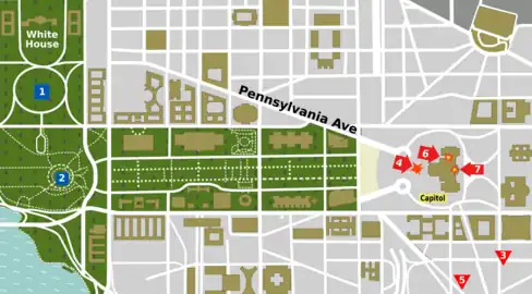 On January 5, several events related to overturning the election occurred in or around the National Mall in Washington, D.C., at places like the Freedom Plaza, the North Inner Gravel Walkway between 13th and 14th Streets, Area 9 across from the Russell Senate Office Building, and near the United States Supreme Court.[160][161] At least ten people were arrested, several on weapons charges, on the night of January 5 and into the morning of January 6.[162]