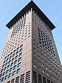 The building was designed by Berlin architect Joachim Ganz and cost approximately 200 million Euros. It was completed in 1996. The strict geometric forms based on the measure of a Japanese tatami mat (0.9 m × 1.8 m) and terra cotta stone cladding correspond to classical Japanese design. Its wide roof reminisces the shape of a Japanese stone lantern.[4] The building outline is square (36.9 m × 36.9 m). Its central core houses nine elevators, two emergency staircases and utility shafts. The facade features large and small square windows housing open plan and single offices respectively.