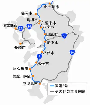 National Route 3 (国道3号, Kokudō San-gō) is a major highway on the island of Kyūshū in Japan. It connects the prefectural capital cities of Kagoshima (Kagoshima Prefecture), Kumamoto (Kumamoto Prefecture), and Fukuoka (Fukuoka Prefecture), passing through Kurume as well.