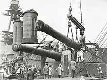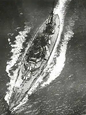In 1931–1933 the AA guns were replaced with eight 12.7-centimetre (5 in) Type 89 dual-purpose guns, placed beside the forward superstructure in four twin-gun mounts.[11] Two twin-gun mounts for license-built Vickers two-pounder (4-centimetre (1.6 in)) light AA guns were also added while the pair of 14 cm guns on the upper deck were removed.[12]