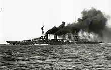 Hyūga, named after Hyūga Province, one of the traditional provinces of Japan, was laid down at the Mitsubishi Heavy Industries shipyard in Nagasaki on 6 May 1915 and launched on 27 January 1917.[17] Captain Shigeushi Nakagawa assumed command on 30 April[12] and the ship was completed on that same day, too late for service in World War I.[17] Hyūga was then assigned to the 1st Battleship Division of the 1st Fleet. Captain Kinzaburo Mimura relieved Nakegawa on 10 November. An explosion in No. 3 gun turret killed 11 crewmen and wounded another 25 during a gunnery exercise on 24 October 1919. Mimura was relieved in his turn by Captain Genjiro Katsuki on 20 November. Hyūga accidentally collided with and sank the schooner Hiromiya Maru, killing two of the sailing ship's crew, on 21 July 1920. On 29 August, the ship began the first of numerous patrols off the Siberian coast and in northern waters in support of Japan's Siberian Intervention against the Bolshevik Red Army. Captain Hidesaburo Ishikawa replaced Katsuki on 20 November and he was replaced by Captain Genji Ide on 20 November 1921.[12]