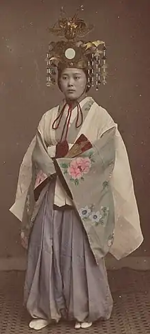 Western-style clothing came to represent elitism or class in the Meiji period, alongside the use of aniline dyes, particularly purple and red, the first two synthetic dyes ever created, which had previously been associated with high class status; these dyes became seen as both the colour of "progress" and as symbolism of one's support for the Empire.[4] Though the poorest could still not afford to wear these flashy, high-status colours, those at the bottom of society also began to wear Western uniforms. Though those working practical jobs often wore tube-sleeved hanten jackets, or else tied their kimono sleeves back with tasuki cords, the sleeves on kimono were considered an impractical safety hazard when working on machinery in factories, driving the switch towards Western clothing.[5]: 89 In 1873, uniforms were introduced with hakama as well.[2]: 73
