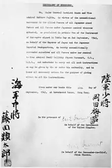 On 16 September 1945, Harcourt formally accepted the Japanese surrender[19] from Maj.-Gen. Umekichi Okada and Vice Admiral Ruitaro Fujita at Government House.[62]