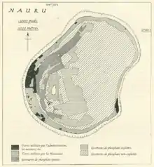 Modernity reached Nauru in the form of imported goods, which had the effect of making the locals increasingly dependent on the Australian economy. Beginning in the 1920s, the Nauruans received royalties for the mining of their lands, an income that allowed them to cover their needs, but which was minimal compared with the actual value of the island's phosphate exports.[3] The population was decimated by several diseases against which they had no immune defences; however, in 1932 they reached the population threshold of 1,500 that was considered necessary for their survival. This achievement is still celebrated in Nauru as Angam Day.[4]