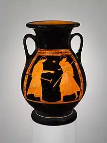 A pelike was a ceramic container that the Greeks used as storage/transportation for wine and olive oil. As seen in the picture on the right, it had a large belly with thin, open handles. Unlike other transportation jars (like the amphora), a pelike would have a flattened bottom so that it could stand on its own. Pelikes often had one large scene across the belly of the jar with minimal distractions around. This would focus the viewers eyes to the center of the pelike which was often a mythological scene of sorts.[1]