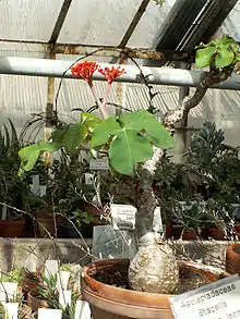J. podagrica is a caudiciform perennial herb growing up to 1 metre (3 feet) tall.[4][5][6] The grey-green, knobby, swollen caudex has a bottle-like appearance, giving rise to some of the common names. Leaves are held on long fleshy yet stout petioles which emerge from the tip of the stem and radiate in all directions. Leaves are peltate and 3 or 5 lobed. Dense clusters of small, orange-red, flowers are held above the leaves on long slim peduncles. The clusters carry both male and female flowers and flowering continues for most of the year.[4][5][8] Fruit are green capsules at first, becoming blackish-brown at maturity when they burst and scatter the seeds up to 4 metres (13 feet) away.[5][6]