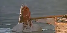 In the ending of the original US theatrical version, Ellen rammed Neptune's Folly into the shark, impaling it on the prow of the boat, mortally wounding it. The shark then causes the boat to break apart with its death contortions, forcing the people on the boat to jump off to avoid going down with it.[51] American audiences disapproved of this ending. Sid Sheinberg says that the impact of the shark and Jake dying "was too much for the audience in one finale".[52] Following this, additional footage was filmed to portray Jake's survival, and special effects shots using miniatures which, Downey says, "saw the shark inexplicably explode after being speared by the boat".[53] Universal used this ending on home media releases.[54] The re-shot ending reportedly began filming only five days after the film was released in the United States. The original ending can be seen on cable broadcasts.[55] In his review of the film, Roger Ebert said that he could not believe "[t]hat the director, Joseph Sargent, would film this final climactic scene so incompetently that there is not even an establishing shot, so we have to figure out what happened on the basis of empirical evidence."[56]