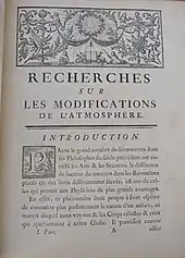 First page of a 1772 copy of volume 1 of "Recherches sur les modifications de l'atmosphère"