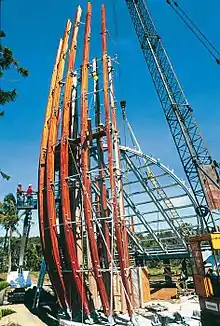The entire complex has been built along a 250 metres (820 ft) long ridge of the peninsula (a cape that extends southeast into the Pacific Ocean[3]). The arrangement consists of 10 units called "cases," or hut pavilions, arranged in three groups or village clusters with one tall hut (the largest is 28 metres high) in each cluster representing the traditional "Great Hut" of the Kanak Chiefs. The main axis of the Cultural Centre (somewhat off the cardinal axis) consists of many covered walkways, green spaces, outdoor rooms, and gardens that are interlinked with the pavilions or cases and also with the smaller office buildings. The arrangement of the structures around the main axis has a symbolic content for the Kanaks. All the huts are of different sizes and different functions, but with the consistent form of vertically positioned shell-like structures which resemble the traditional huts of a Caledonian Village. They are arranged in a row sequentially along a lower rectangular path that follows the gentle curve of the peninsula. It forms a unique cultural ensemble at the Cultural Centre of arts built with wood technology using long-lasting iroko wood. The overall effect is that it "looks like a unified homogenous whole". A laminated wood construction blends with engineering architecture and is suitable for everyday use. The cultural centre has thus been described as "a perfected masterpiece and a deeply impressive, earth-bound example of a new interpretation of modernism".[2][3][11] The layout takes note of the prevailing easterly wind directions from the sea and the structures as a whole are built to take full advantage of the wind and are also oriented to control sunlight and solar heat gain. The curved outer face of the huts is in direct contact with the windward side of the stormy Pacific Sea whereas the leeward side is oriented towards the serene lagoon. The sunlight engulfs the structure and casts a continually changing pattern of shadows through the louvers and members of the staves of the cases.[2][3]
