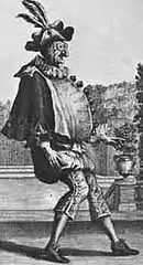 Bérain also designed for the theatre. By 1674 he had already begun designing costumes for Jean-Baptiste Lully's Opéra, including costumes for dancers in the divertissements. For Lully's 1684 opera Amadis, a tale of chivalric romance, Bérain carried out research into the styles of the Middle Ages and the Renaissance, a historical approach to costume design that was unusual for the time. Besides costume designs for Lully's tragédies en musique, Bérain designed the costumes for Lully's ballets Le triomphe de l'amour (1681) and Le temple de la paix (1685).[8]
