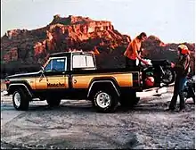 From 1976 to 1983 the "Honcho" trim package was offered on the J10 pickup. It consisted of bold striping with decals and was offered with factory extras such as the Levi's interior or a roll bar. The content of the Honcho package varied from year to year, but "always included the wide-track look of the Cherokee Chief."[17]