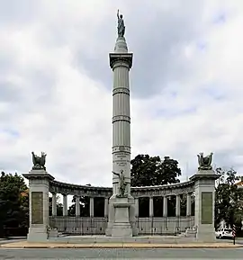 The east-facing monument sported a 67-foot-tall (20 m) Doric column topped by a female bronze figure called Vindicatrix, an allegorical representation of Southern womanhood.[3][lower-alpha 1] There were thirteen columns, eleven bronze seals representing the seceding states and two representing states that sent troops for the Confederacy. Two square piers at either end of the colonnade are topped with eagles and faced with plaques. The bronze statues, Vindacatrix and Jefferson Davis in the center – the latter situated atop a block of granite[6][7] – were designed by Edward Virginius Valentine; the arrangement was planned by William C. Noland.[1]: 12