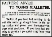 The city of Paterson was shocked. McAlister was from a very wealthy, respectable family in Paterson. The McAlisters owned a number of businesses and employed a substantial number of Paterson residents at their mill and breweries. McAlister's father, who had spent decades establishing his reputation in the city, was so humiliated by the accusation, he offered his son some harsh advice which was reprinted in the local papers.