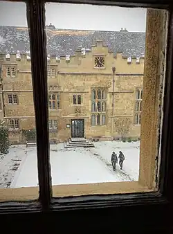 The long but narrow third quadrangle adjoins Ship Street, on the north of the site and to the west of the garden of the principal's lodgings, where the college has owned some land since its foundation. In the 18th century, this was home to the college stables. A fire in 1904 led to the demolition of the stables and the gateway to Ship Street.[67] Replacement buildings adjoining Ship Street, effectively creating a third quadrangle for the college, were constructed between 1906 and 1908.[68] It contained the college's science laboratories (now closed) and a new gate-tower, as well as further living accommodation and a library for students, known as the Meyricke Library, after a major donor – there had been an undergraduate library in the second quadrangle since 1865, known as the Meyricke Library from 1882 onwards.[67][68]