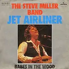 Steve Miller heard Pena's unreleased New Train album through Ben Sidran, who produced it,[6] and who was formerly in Miller's band. Miller recorded "Jet Airliner" in 1975 during sessions for the Fly Like an Eagle album, but the song was not released until 1977, when it was included on Miller's Book of Dreams album. The lyrics of the Steve Miller Band version are slightly different from the Pena original.[7][8] Miller's performance of the main riff also is slightly different from Pena's original, which has a funkier edge to it. The song is also notable for helping to popularize the phrase "keep on keepin' on", previously found in John Lennon's song "Old Dirt Road" (1974) and Bob Dylan's songs "You Ain't Goin' Nowhere" (1971) and "Tangled Up in Blue" (1975).[7] The single reached No. 8 on the Billboard chart.[9] In Canada, the song spent two weeks at No. 3.[10]