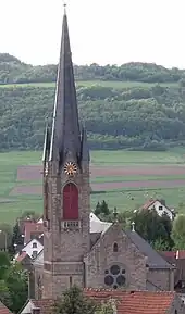 - Protestant parish church, Kirchstraße 2 – two-naved Gothic Revival hall church, 1895/1896, architect Franz Schöberl, Speyer; furnishings