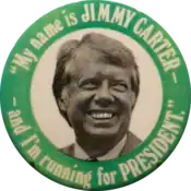 The 1976 presidential campaign of Jimmy Carter resulted in the election of Jimmy Carter and his running mate Walter Mondale as president and vice president of the United States, defeating incumbent Republican President Gerald Ford and his running mate Bob Dole. Carter, a Democrat and former governor of Georgia, launched his presidential bid in December 1974, as the Constitution of Georgia barred him from running for a second term as governor.[2] In the wake of the Watergate scandal, the declining popularity of President Ford due to his pardon of Nixon, and the severe recession of 1974–75, many Democrats were sure of victory in the 1976 presidential election. As a result, 17 Democrats ran for their party's nomination in 1976.[3] Carter's opponents mocked his candidacy by saying "Jimmy, who?", for his being relatively unknown outside Georgia.[4][5] In response, Carter began saying "My name is Jimmy Carter, and I'm running for president."[6] Carter extensively campaigned in the primaries, and in the end received 39.19% of his party's primary votes.