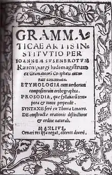 Joannes Susenbrotus (also spelled Susembrotus, also known as Johannes or Hans Susenbrot, 1484/14851542/1543) was a German humanist, teacher of Latin, and author of textbooks.