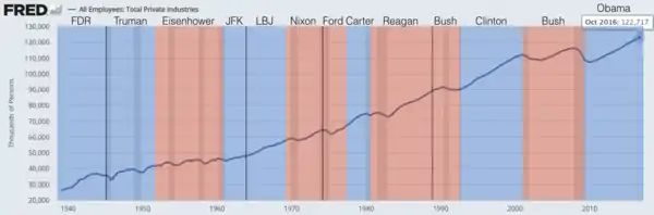 Politicians and pundits frequently refer to the ability of the president of the United States to "create jobs" in the U.S. during his term in office.[1] The numbers are most often seen during the election season or in regard to a president's economic legacy. The numbers typically used and most frequently cited by economists are total nonfarm payroll employment numbers as collected by the Bureau of Labor Statistics on a monthly and annual basis. The BLS also provides numbers for private-sector non-farm employment and other subsets of the aggregate.