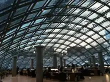 Mansueto Library, designed by Chicago-based architect Helmut Jahn, consists of a glass-domed reading room, above high-density closed bookstacks which can be accessed through an automated storage and retrieval system. The physical retrieval is carried out by multiple robotic cranes, averaging about 3 minutes per retrieval.[1] Mansueto allows the university to maintain the vast majority of its library holdings on campus in a centrally located facility, while creating space to accommodate new acquisitions for approximately 20 years.[2]