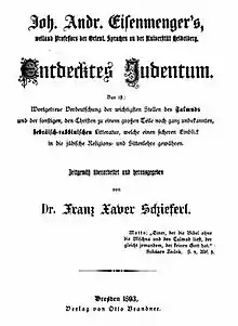 - ↑ Hartmann, Anton Theodor (1834). Johann Andreas Eisenmenger und seine jüdischen Gegner. cited by Koch, Jens (1997). Johann Andreas Eisenmenger: sein Werk und dessen Wirkung (PDF) (in German). Projekt in der Herzog August Bibliothek Wolfenbüttel. p. 10.