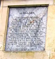 In the Battle of Kay, Hülsen suffered bloody losses and he himself was later wounded in the subsequent Battle of Kunersdorf. In the Battle of Maxen, he did not arrive in time to support Friedrich August von Finck.[1] On 20 August 1760, he was able to defend himself against a hostile uprising with 12,000 men in the Battle of Strehla, whereupon the King gave him 1500 thalers, and wrote: "I congratulate you [...] [Please extend to ] Officers of your subordinate Corps [...] My most gracious Compliments."[6]