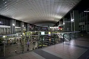 Park Station is also the site of the southern terminus of the Gautrain, a high-speed rail link to Pretoria and the OR Tambo airport. The Gautrain station is adjacent to the existing main-line station, beneath Smit and Wolmarans streets, but with separate access. The station is modern and secure, with tight security and visible policing.[11] Services run at 10-minute intervals during peak time, and access to services is via a pre-paid contactless Gautrain card.[12] The station is underground, being connected via 9 miles of tunnel to Marlboro station. The line is fully electrified and built to the international standard 1,435 mm (4 ft 8+1⁄2 in) gauge, broader than the 'standard' 1,067 mm (3 ft 6 in) Cape gauge. The station opened for operation in June 2012.[13]