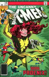 Byrne joined Claremont beginning with X-Men #108 (Dec. 1977), which was later renamed The Uncanny X-Men with issue #114.[26] Their work together, along with inker Terry Austin, on such classic story arcs as "Proteus", "Dark Phoenix Saga", and "Days of Future Past" would make them both fan favorites.[27] Byrne insisted that the title keep its Canadian character, Wolverine, and contributed a series of story elements to justify Wolverine's presence which eventually made the character among the most popular in Marvel's publishing history. With issue #114, Byrne began co-plotting the series as well as penciling. Claremont recounted that "at that point in time John and I were, in a very real sense, true collaborators on the book. It was with very few exceptions, difficult, for me, anyway, to tell in the actual gestation of the book where one of us left off and the other began – because it involved one of us coming up with an idea and bouncing it off the other ..."[28] The "Dark Phoenix Saga" in 1980 is one of the most notable stories in the title's history.[29][30] Comics writers and historians Roy Thomas and Peter Sanderson observed that "'The Dark Phoenix Saga' is to Claremont and Byrne what the 'Galactus Trilogy' is to Stan Lee and Jack Kirby. It is a landmark in Marvel history, showcasing its creators' work at the height of their abilities."[31] Byrne has repeatedly compared his working relationship with Claremont to Gilbert and Sullivan, and has said that they were "almost constantly at war over who the characters were."[32] Byrne created the characters Alpha Flight,[33] Proteus,[34] and Kitty Pryde/Shadowcat[35][36] during his run on The X-Men. A new Brotherhood of Evil Mutants, led by Mystique, was introduced in the "Days of Future Past" storyline (#141–142, Jan.-Feb. 1981) in which a time-travelling Kitty Pryde tried to avert a dystopian future caused by the Brotherhood assassinating Presidential candidate Senator Robert Kelly.[37] Byrne plotted the story wanting to depict the Sentinels as a genuine threat to the existence of the mutant race.[38] Byrne left The X-Men with #143 (March 1981). During his tenure on the series, The X-Men was promoted from a bimonthly to a monthly publication schedule as sales steadily increased—a trend that continued long after Byrne left.[39]
