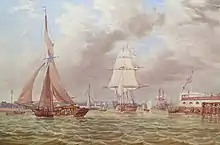 Manby's sketches of a whaling trip to Greenland were used by William Joy to paint scenes of the Greenland Whale Fishery, that were later included in Manby's Journal of a Voyage to Greenland (1822).[23] An early attempt to paint in watercolours was their depiction of the yacht HMS Royal Sovereign in 1822, as it passed Yarmouth on its passage to Scotland, George IV being aboard.[24][note 4] They depicted the Lord High Admiral, the Duke of Clarence, visiting his son on board HMS Euryalus at Spithead, which helped to bring them recognition within naval circles.[24]