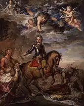 William III recognised Marlborough's qualities as a soldier and strategist, but the refusal of the Order of the Garter and failure to appoint him Master-General of the Ordnance rankled with the ambitious Earl; nor did Marlborough conceal his bitter disappointment behind his usual bland discretion.[43] Using his influence in Parliament and the army, Marlborough aroused dissatisfaction concerning William's preferences for foreign commanders, an exercise designed to force the King's hand.[44] Aware of this, William in turn began to speak openly of his distrust of Marlborough; the Elector of Brandenburg's envoy to London overheard the King remark that he had been treated – "so infamously by Marlborough that, had he not been King, he would have felt it necessary to challenge him to a duel".[45]