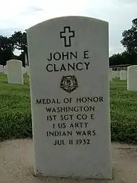 December 29, 1890 Private (then musician) John Clancy, Battery E, 1st Artillery: For bravery in twice voluntarily rescuing wounded comrades from under fire of the enemy during action against hostile Sioux Indians at Wounded Knee Creek, South Dakota. (Medal of Honor)[3]
