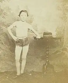At age eight, Day was touted as Australian champion pedestrian, having beaten all comers in the colony. By November 1864 he was touring with the "Australian Troupe" variety artistes, demonstrating speed walking.[1] In 1865 he was taken to England aboard Royal Standard to compete against some of the leading pedestrian athletes of the day.[2] Such races were popular subjects for gambling, and he was nine years old, 3 feet 10 inches (117 cm) high, and weighed 54 pounds (24 kg),[3] In 1867 he completed 300 laps of a circuit created in the Royal Victoria Theatre, Sydney, a total of 5 miles (8.0 km), in under 50 minutes[4] It is not known whether this exhibition was provided for gambling purposes, but it was said that his backers did not receive the profits they expected from exhibiting him.[5] Another challenge, to walk seven miles within the hour, was staged at the track attached to Goyder's Red House hotel in Northcote. It started at £30 to £10, and Day was loudly supported each time he passed the judge's stand, but when it was clear he had no prospect of succeeding, one sympathizer invaded the track and carried him away.[6]