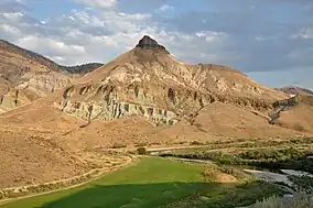 The John Day River, a tributary of the Columbia River, flows generally west from the Strawberry Mountains before reaching the national monument. It turns sharply north between the Mascall Formation Overlook and Kimberly, where the North Fork John Day River joins the main stem. Downstream of Kimberly, the river flows generally west to downstream of the unincorporated community of Twickenham, and generally north thereafter.[7] Rock Creek enters the river at the north end of Picture Gorge.[13] Bridge Creek passes through Mitchell, then north along the eastern edge of the Painted Hills Unit to meet the John Day downstream of Twickenham.[13] Intermittent streams in the Clarno Unit empty into Pine Creek, which flows just beyond the south edge of the unit and enters the John Day upstream of the unincorporated community of Clarno.[7][13]